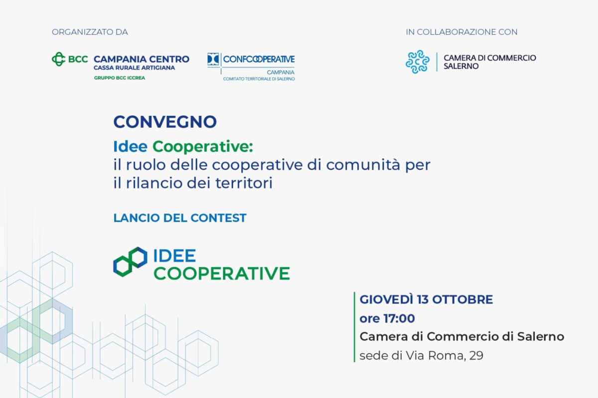 In occasione dell’evento “Idee Cooperative: il ruolo delle cooperative di comunità per il rilancio dei territori”, sarà lanciato il contest “IDEE COOPERATIVE”, uno dei primi a livello nazionale di questo genere, finalizzato a stimolare in provincia di Salerno, e in particolare nei piccoli centri, la costituzione di cooperative di comunità.
