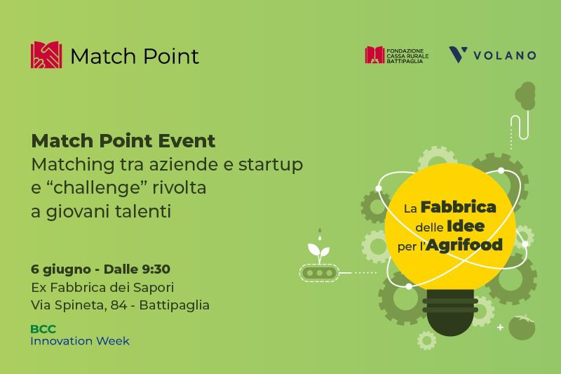 Conto alla rovescia per la prima edizione di Match Point, il programma di open innovation promosso dalla Fondazione Cassa Rurale Battipaglia e da Volano, advisory boutique specializzata in venture capital, private equity e operazioni di finanza strutturata, nell’ambito della BCC Innovation Week, in collaborazione con Banca Campania Centro, BCC Capaccio Paestum e Serino e BCC Magna Grecia e con i partner tecnici Campania Digital Innovation Hub, Beeco e Gruppo Stratego.